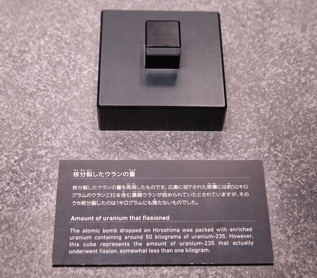 Museo della Pace. La bomba atomica, soprannominata Little Boy, conteneva 50 kg di uranio 235: soltanto una minima parte, poco meno di un kg, ha subito la fissione e prodotto la distruzione di Hiroshima.